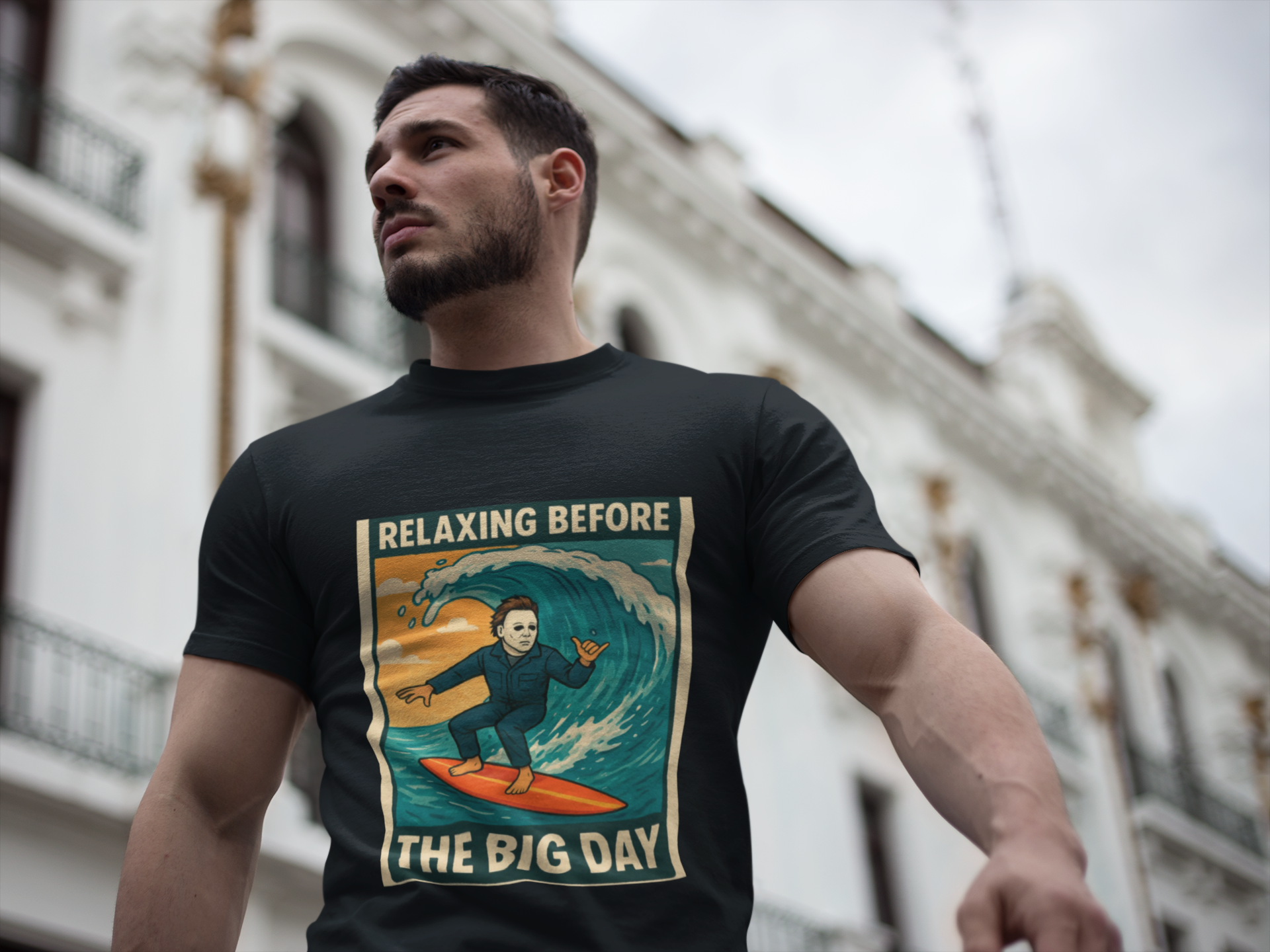 A classic fit T-Shirt featuring a design of Michael Myers surfing at the beach, creating a unique and fun atmosphere perfect for Halloween enthusiasts. This tee is made with medium fabric consisting of 100% cotton for year-round comfort and sustainability, ensuring a relaxed wear with a neat crew neckline that can suit casual or semi-formal occasions.