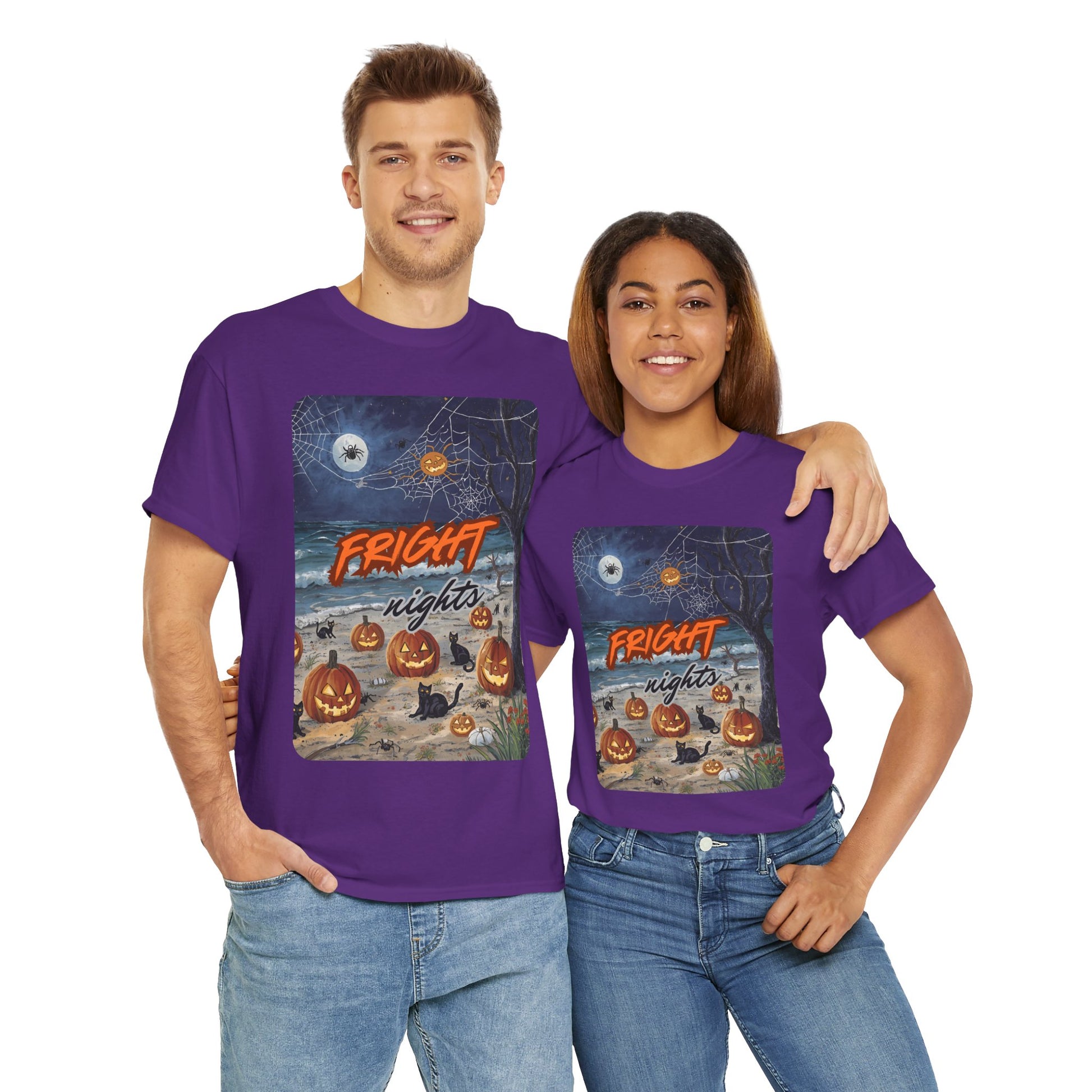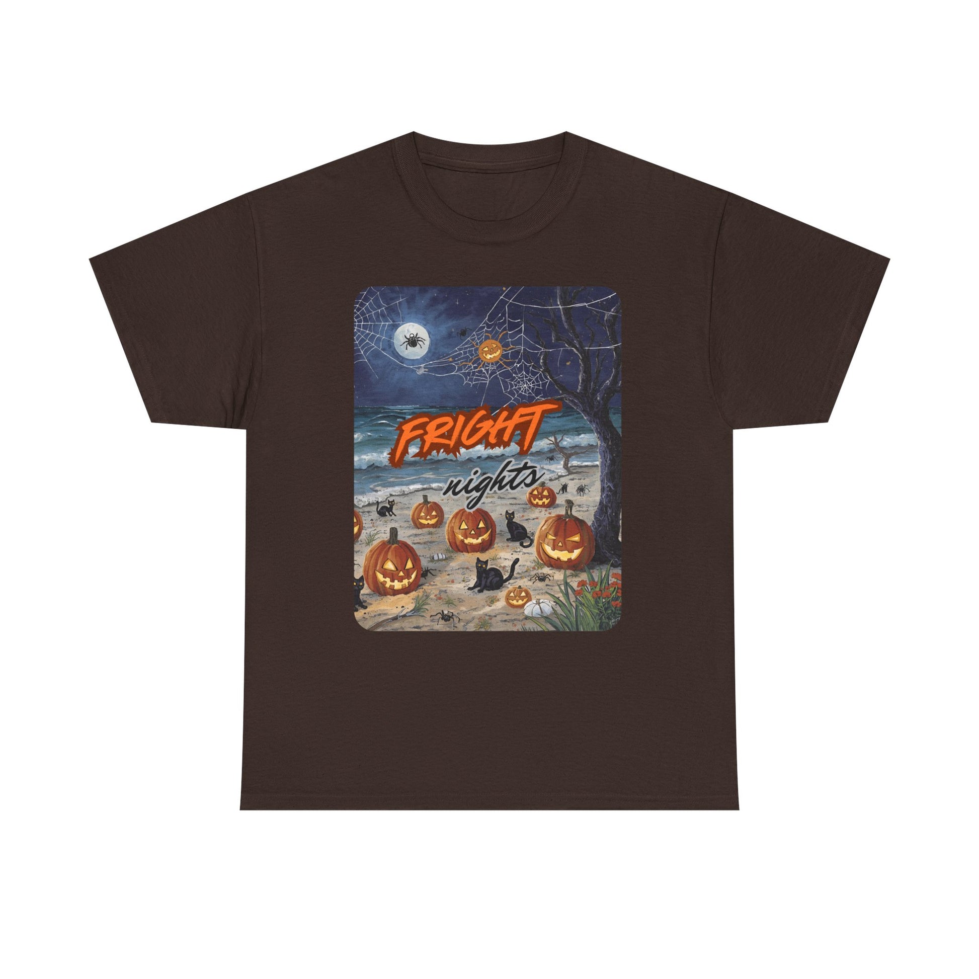 A spooky Halloween-themed T-Shirt featuring a design of being at the beach at night with spider webs, black cats, and pumpkins. Perfect for Halloween enthusiasts looking to add a touch of creepy fun to their wardrobe. Ideal for adults looking for a unique and festive outfit to wear during the Halloween season.